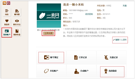 点击【我的账户】进入我的账户页面,可以上传头像,修改个人的基本信息,同时可以绑定微博、查看自己的勋章和资金账户信息。